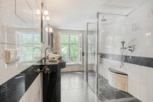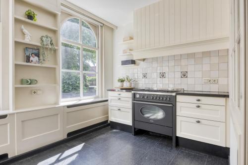 De open keuken aan de voorzijde van het huis is ingericht in Oud-Hollandse stijl met klassieke kastdeuren en warm tegelwerk met decoratieve accenten. De keuken is uitgerust met diverse inbouwapparatuur waaronder een Smeg fornuis, vaatwasser, koelkast en afzuigkap. Ook hier zorgen de grote ramen weer voor een prachtige lichtinval en uitzicht op het groen van buiten. De ingebouwde nissen en open planken bieden een speelse touch en praktische opbergruimte.