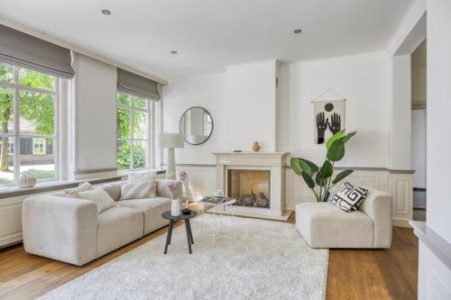 Via de stijlvolle voordeur betreed je de woning in een ruime hal met toilet, meterkast en toegang tot de woonkamer. Bij binnenkomst in de woonkamer valt direct de overvloed aan natuurlijk licht op. Dankzij de grote raampartijen, het neutrale kleurenpalet, de stijlvolle wandpanelen en de eikenhouten vloer voelt de ruimte sfeervol en ruim aan. De klassieke marmeren schouw met gashaard vormt het warme middelpunt van de zitkamer, ideaal voor gezellige avonden. De zithoek biedt volop ruimte voor een royale bank.