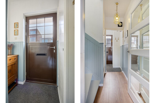 Via de voordeur kom je in de sfeervolle hal, die speels is ingedeeld. Het laminaat, de lambrisering, paneeldeuren en moderne kleurkeuzes zorgen voor een warme en uitnodigende uitstraling. In de hal bevinden zich de meterkast, het toilet en de trap naar boven. Dankzij het glas in zowel de voordeur als de tussendeur komt hier veel daglicht binnen.