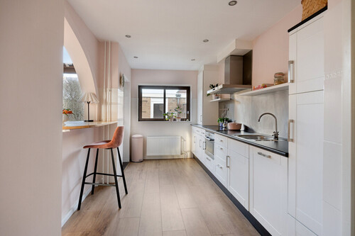 De keuken is uitgebouwd en het aanrechtblad strekt zich uit over de volledige lengte van de ruimte. Je hebt hier volop kastruimte en diverse inbouwapparaten, waaronder een inductiekookplaat, afzuigkap, vaatwasser, oven en koelkast. Extra opbergruimte vind je in de handige trapkast. De bar tussen de keuken en de woonkamer is een fijne plek voor een ontbijt of om gezellig aan te schuiven tijdens het koken.