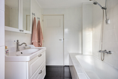 De badkamer is wat ouder, maar gemoderniseerd en daardoor direct te gebruiken. Hij beschikt over een ligbad met douche, een wastafelmeubel met spiegel en verlichting. Via de badkamer heb je toegang tot het balkon aan de voorzijde van de woning, ideaal voor extra ventilatie.