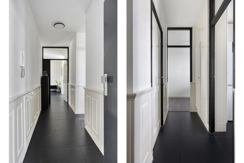 Het appartement ligt op de eerste verdieping, aan het einde van de galerij, waardoor het rustig en prettig gelegen is. Bij binnenkomst in de royale hal valt direct de verzorgde afwerking op. De strakke donkergrijze tegelvloer in combinatie met de glad gestucte wanden en plafonds vormt een moderne en rustige basis. De klassieke paneeldeuren, de lambrisering langs de wanden en de radiatoren, die netjes zijn weggewerkt achter stijlvolle betimmering, dragen bij aan een verzorgde en sfeervolle afwerking.
