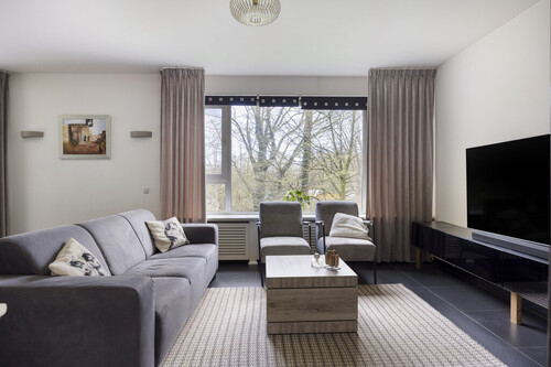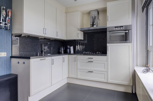 De woonkamer staat in open verbinding met de keuken, wat zorgt voor een ruimtelijk en eigentijds geheel. Dankzij de grote raampartijen profiteert de leefruimte van veel natuurlijk licht. De keuken in hoekopstelling is uitgevoerd met lichte fronten en een stijlvol donker werkblad en is voorzien van diverse inbouwapparatuur, waaronder een gaskookplaat, afzuigkap, combi-oven, vaatwasser en koelkast. Dankzij de ruime boven- en onderkasten is er volop opbergruimte voor al het keukengerei. Het aangrenzende raam zorgt bovendien voor een prettige lichtinval en een fraai uitzicht op het omliggende groen.