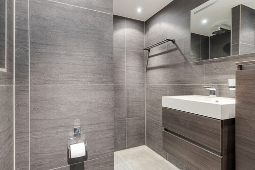 De badkamer heeft een ruime inloopdouche met regen- en handdouche, een modern wastafelmeubel met spiegel en een wandcloset. Daarnaast beschikt het appartement over een aparte wasruimte/berging met aansluitingen voor wasapparatuur en een vaste kast voor extra opslag.